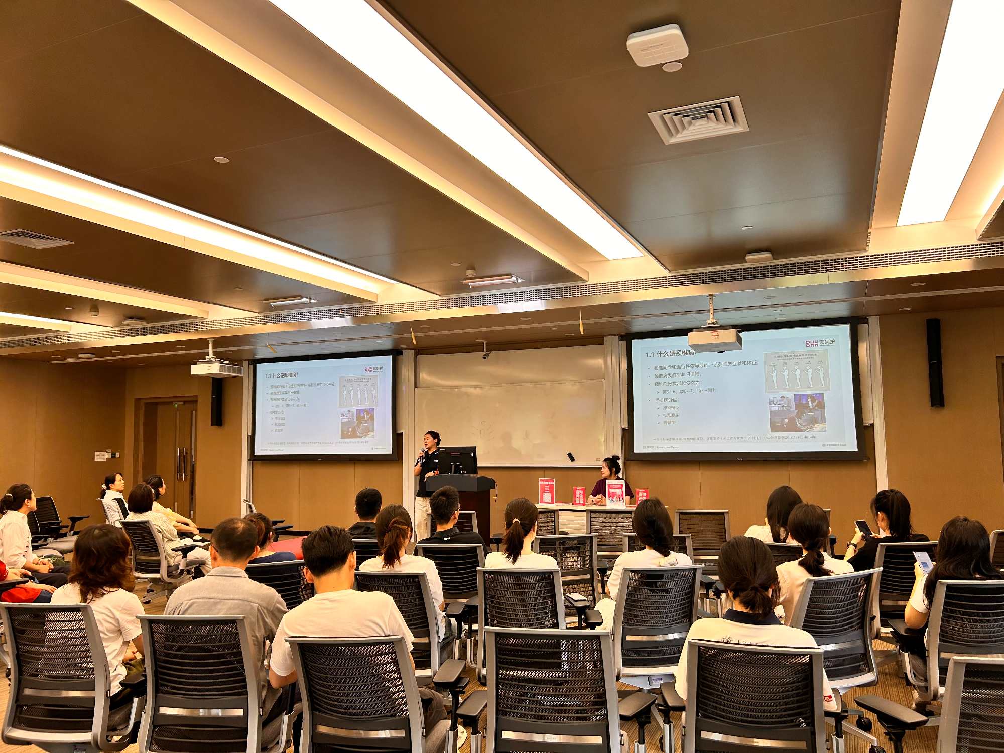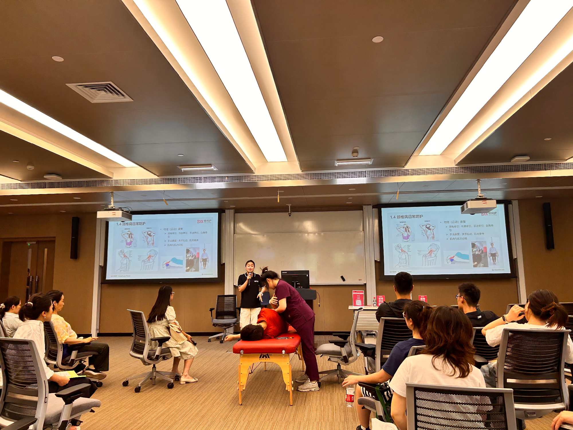长期伏案工作易引发颈椎、腰椎等职业健康问题。为帮助学院教职工科学防治相关疾病,学院工会联合EMBA校友企业“呗呵护”运动康复中心于2025年5月22日中午举办 “颈肩腰腿痛及运动损伤防治”健康讲座。讲座由资深康复治疗师汪秀主讲,内容涵盖颈椎病、腰椎病的预防与治疗,运动损伤的康复方法以及脊柱侧弯的发现与治疗,吸引了60余位教职工报名参加。