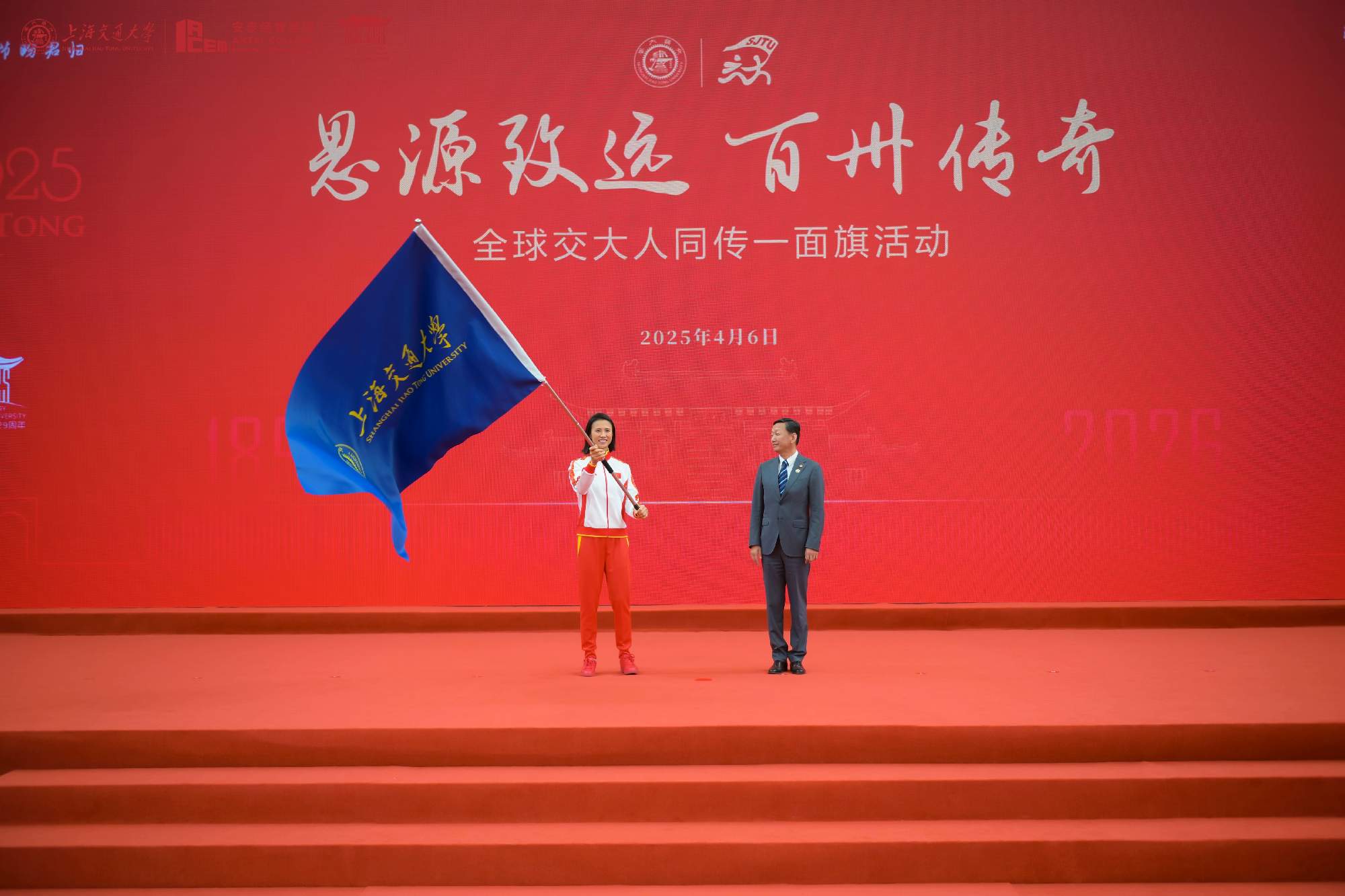 为迎接上海交通大学130周岁生日,“思源致远·百卅传奇”全球交大人同传一面旗活动启动仪式在徐汇校区红太阳广场举行,杨振斌代表母校宣布活动启动,并将校旗传递给安泰经管学院2013届本科校友、中国女子帆船运动员、2012年伦敦奥运会金牌获得者徐莉佳。这面校旗将从东海之滨启程并正式开始它的全球之旅。一年后,承载着全球校友满满祝福的校旗将重返思源湖畔,为母校建校130周年送上最珍贵的祝福。