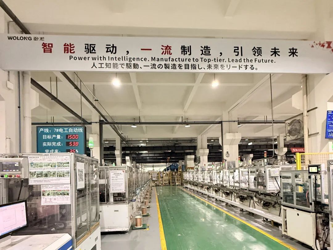 校友们参观了卧龙家用电机事业部的数字化车间。车间内通过MES系统实现了生产全流程的智能化管理,AGV智能搬运、机械臂精准焊接等技术广泛应用,生产效率提升80%,运营成本降低33%,产品不合格率下降50%。